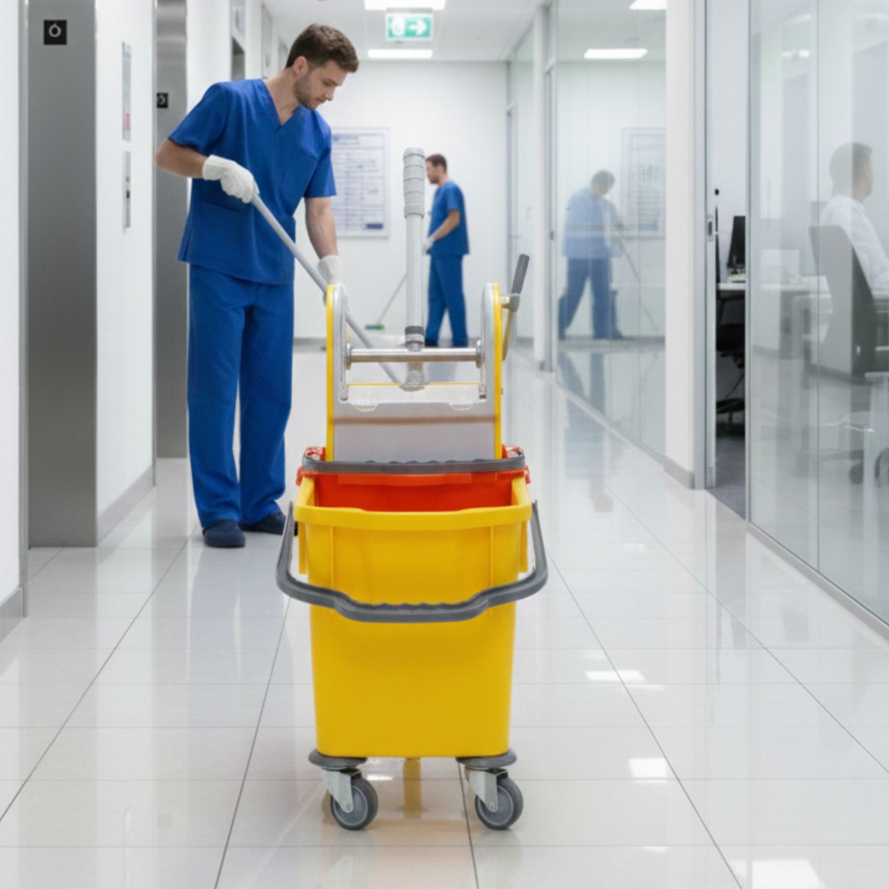 Bestellen Sie den Reinigungstrolley mit Mopp-Presse jetzt online und erleichtern Sie Ihrem Reinigungsteam den Arbeitsalltag mit einem kompakten, ergonomischen und professionellen System.